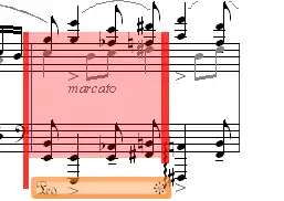 The 'new' marker is one indication of when to play the pedal. You would depress the sustain pedal at the moment in the music when the bracket (highlighted in orange) 'begins,' and release it when the bracket is closed. In this example, the sustain pedal should be held throughout the light red section, and released when the music passes the dark red rectangle on the right.