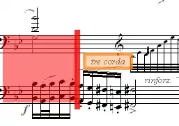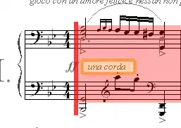 The marker is the words una corda (or una corde). Depress the soft pedal from the beginning of the words until instructed to release, at the words tre corda (or tutte corde). In the examples to the right, the soft pedal would be held from the very beginning of the music until the dark red rectangle after the tre corda.