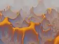 If, in a three-dimensional coordinate system, we imagine the plane with the Mandelbrot or the Julia set as the x,y-plane and plot the distance function in the z-direction, we have a surface looking like a landscape, and we can view it from the side. Such a picture must be drawn from the top and downwards (on the screen), and from the far distance towards the near (in the landscape), so that something will grow and hide what was previously drawn.