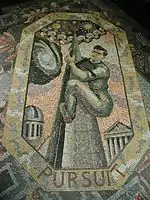 A mosaic depicting Fred Hoyle climbing to the stars, with a book under his arm, in the National Gallery in London.