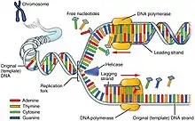 DNA replication involves un-zipping DNA with helicase, and building copies of the missing side on both the leading strand and lagging strands of the original DNA molecule. The leading strand is built by continuous replication, the lagging strand is built in a piecemeal fashion. The end result is that each new copy has half of the molecule of the original cell, and half newly replicated.