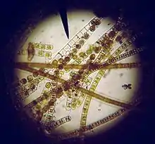 The two strands of cyanobacteria found in a pond have come together near the pointer. Tiny sex pilus formed as one cell moves across to fuse with the other cell, leaving it empty. This is a primitive method of sexual reproduction to increase variation within a population.