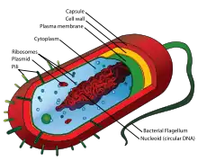 Bacteria belong to a group of unicellular organisms, called the prokaryotes that exhibit a cellular membrane and wall that surrounds a free-floating circular DNA molecule held in a cytoplasm fluid with various proteins produced by ribosome RNA, and coded by the DNA molecule. The cellular membrane and wall are constructed by lipids and proteins, produced by RNA from amino acids and carbohydrates that most bacteria will consume from the outside environment. Some bacteria exhibit long, whip-like protrusions from their cellular wall that aids cellular locomotion, called flagella, while others are able to secrete calcium carbonate forming a hard-skeletal cellular wall. Prokaryotes mostly reproduced by asexual reproduction by binary fission, which is where the DNA molecule replicates a nearly identical functional copy and the cellular membrane pitches off into two cells (cytokinesis), each containing a DNA molecule. Most prokaryotes replicate by this simple process of asexual reproduction. Hence, a single cell can reproduce very quickly by doubling. As long as there is sufficient amino acids and carbohydrates in the environment and or proteins, bacteria can quickly reproduce to large numbers from a single cell. This doubling allows bacterial colonies to grow rapidly in population size.