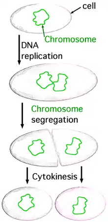Binary fission is the simple method of asexual reproduction of bacteria, where the DNA molecule (chromosome) is replicated, and two cells emerge from cytokinesis by splitting the cellular membrane into two cells.