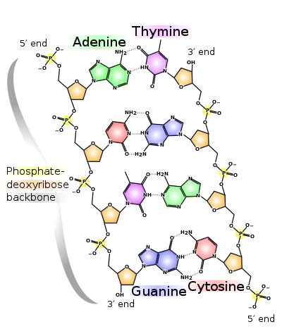 DNA is short for deoxyribonucleic acid a large organic molecule composed of two polynucleotide chains that coils around each other forming a double helix. Each molecule of DNA is unique as to each molecule, and carries very large strains of individual unique nucleotides, which are composed of one of four nucleobases (cytosine [C], guanine [G], adenine [A], and thymine [T]), each connected to deoxyribose and a phosphate group, that provides the sugar-phosphate backbone to DNA. The double helix strains are held together by weak hydrogen bonds between the nucleobases, with adenine [A] pairing with thymine [T], and cytosine [C] pairing with guanine [G]. These pairings are easily broken during the first step of replication of the DNA molecule, where the double helix is “unzipped,” using an enzyme called helicase. The two single loose strands of DNA will act as templates to make new copies.