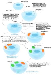 Serial endosymbiosis, which views that eukaryotic cells as composed of various individual cells of primordial prokaryotic cells that form organelles in the cell including chloroplasts and mitochondria.
