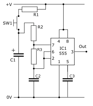 The size of the control capacitor, C1, governs the time it takes to run down. Bear in mind that for a very large value of C1, R1 must be small enough to allow the control capacitor to charge in the time that SW1 is pressed down.