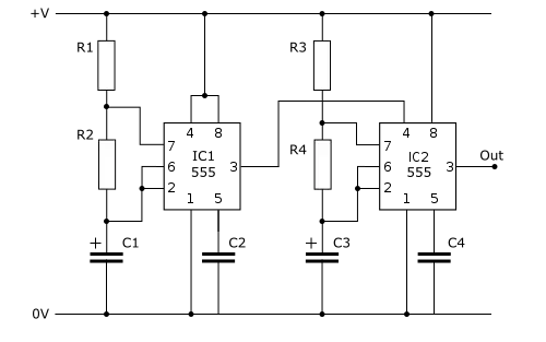 The entire circuit can be made using only one IC by using a 556 timer IC, which contians two identical 555 circuits. The circuit will be the same, but the pin numbers will be different.