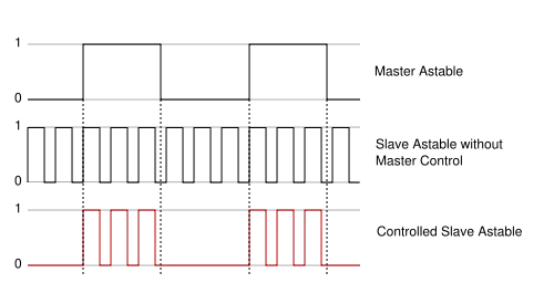 The slave astable will not actually give the second signal, the master turns the output of this astable off when it is not giving a high itself, but this signal represents the ouput of the second astable if it had Pin 4 permanently connected high.