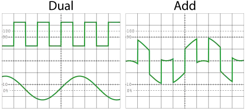 Each channel has a copy of most of these controls (except chop/alt, which applies to all channels). The way the channels are combined is set using 15, which is usually a sliding switch. When set to CH. 1, only the trace from Channel 1 is displayed, and likewise for CH. 2. When DUAL is selected, the traces are shown side by side. This is when the chop/alt control applies. ADD shows the sum of the two traces as one trace. By inverting the traces, one can be subtracted from the other. This can be seen in the illustration below. This shows a square wave on one channel and a sinusoidal wave on the other. On the left, the scope is set to "dual", and the two traces are shown side by side. On the right, the scope is set to "add", and the trace is the sum of the two signals.