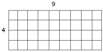 The above area rectangle models the problem 9 x 4, which equals 36. Note that there are 4 rows and 9 columns and that the height of the rectangle is 4 units and the width (or base) is 9 units. Students find that when they count the 9 unit rows four times, they will count a total of 36 units. Soon, they come to the realization that if they were to count the 4 unit columns nine times, they arrive at the same answer. This becomes one of the ways that they learn the commutative property: a x b = b x a (See:Wikipedia:Commutativity) Eventually, students should memorize all of combinations of multiplying single digit numbers, but it should be noted that just because a student has memorized their multiplication facts that they necessarily understand at an abstract level what multiplication represents. Note that the above rectangle has a total of 36 square units, which serves to introduce students to the geometric axiom that area of a rectangle is equal to the base (9 in this case) times the height(4).