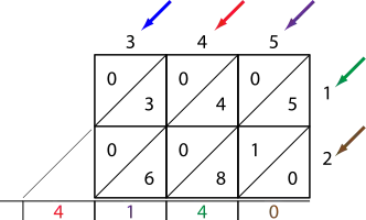 In the right image, each diagonal is summed to produce a number on the bottom; digits are carried to the diagonal on the left.