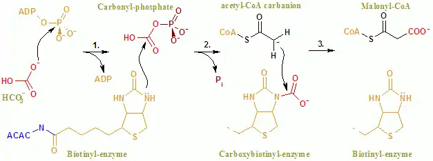 Cartoon diagram of Biotin Carboxylase of E.Coli Acetyl CoA Carboxylase Biotin Carboxyl Carrier Protein of E. Coli Acetyl CoA Carboxylase Carboxyltransferase Subunit of E. Coli Acetyl CoA CarboxylaseThe overall reaction of ACAC(A,B) proceeds by a two-step mechanism.[27] The first reaction is carried out by BC and involves the ATP-dependent carboxylation of biotin with bicarbonate serving as the source of CO2. The carboxyl group is transferred from biotin to acetyl CoA to form malonyl CoA in the second reaction, which is catalyzed by CT.
