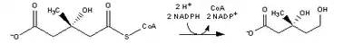 | HMG-CoA is reduced to mevalonate by NADPH. This reaction occurs in the cytosol. It is the rate limiting step in cholesterol synthesis, which is why the enzyme catalyzing the reaction is a target of statins. | HMG-CoA reductase | |