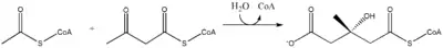 | Acetyl-CoA condenses with acetoacetyl-CoA to form 3-hydroxy-3-methylglutaryl-CoA (HMG-CoA). | HMG-CoA synthase | |