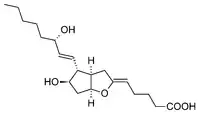 | Prostacyclin I2. The second ring distinguishes it from the prostaglandins. | Leukotriene E4, an example of a cysteinyl leukotriene. | ||