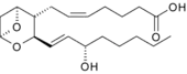 | Prostaglandin E1. The 5-member ring is characteristic of the class. | Thromboxane A2. Oxygens have moved into the ring. |