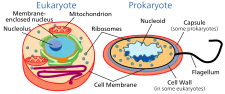 Prokaryotes are single-cell organisms that do not have a nucleus, mitochondria, or any other membrane-bound organelles. In other words, neither their DNA nor any of their other sites of metabolic activity are collected together in a discrete membrane-enclosed area. Instead, everything is openly accessible within the cell, some of which is free-floating[3]. A distinction between prokaryotes and eukaryotes (meaning true kernel, also spelled "eucaryotes") is that eukaryotes do have "true" nuclei containing their DNA. Unlike prokaryotes, eukaryotic organisms may be unicellular, as in amoebae, or multicellular, as in plants and animals. The difference between the structure of prokaryotes and eukaryotes is so great that it is sometimes considered to be the most important distinction among groups of organisms. The cell structure of prokaryotes differs greatly from that of eukaryotes. The defining characteristic is the absence of a nucleus. Also the size of Ribosomes in prokaryotes is smaller than that in eukaryotes, which is now where respiration takes place. The genomes of prokaryotes are held within an irregular DNA/protein complex in the cytosol called the nucleoid, which lacks a nuclear envelope. [52]