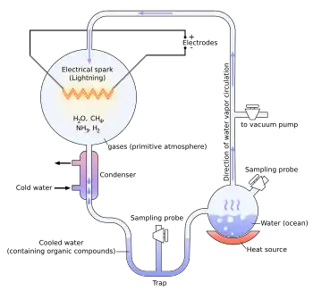 The experiment used water (H2O), methane (CH4), ammonia (NH3), and hydrogen (H2). The chemicals were all sealed inside a sterile array of glass tubes and flasks connected in a loop, with one flask half-full of liquid water and another flask containing a pair of electrodes. The liquid water was heated to induce evaporation, sparks were fired between the electrodes to simulate lightning through the atmosphere and water vapor, and then the atmosphere was cooled again so that the water could condense and trickle back into the first flask in a continuous cycle.