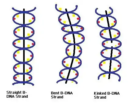 From left to right, a straight B-DNA strand, a bent B-DNA strand, and a kinked B-DNA strand