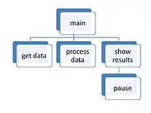 The hierarchy chart (also known as a structure chart) shows the relationship between various modules. Its name mostly comes from showing the organization (or structure) of a business, with the president of the business at the top, followed by the vice president etc., continuing down until the lowest level workers are reached. Within the context of a computer program, it shows the relationship between modules (or functions). Detailed logic of the program is not presented. It does represent the organization of the functions used within the program, showing which functions are calling on a subordinate function. Those above are calling those on the next level down, almost like how a manager orders an employee to complete a task.