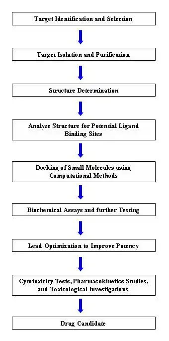 The process of drug discovery within the modern scientific context is quite complex, integrating many disciplines, including structural biology, metabolomics, proteomics, and computer science, just to name a few. The process is generally quite tedious and expensive, given the sheer amount of possibilities of drug-to-target interactions in-vivo, and the necessity of successfully passing rigorous pharmacokinetic studies and toxicology assays prior to even being considered for clinical trials (Burbaum). Though a more detailed explanation is offered further into this text, several key components of the drug discovery process include target selection, lead identification, and preclinical and clinical candidate selection. The schematic on the right outlines the steps involved in the drug discovery process.