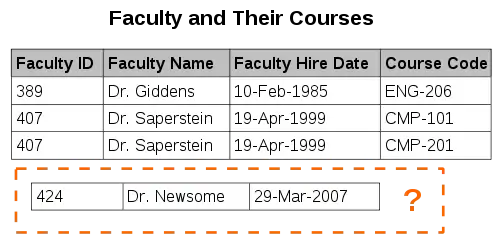 This example shows an insertion anomaly. A new faculty member has been hired, but this information cannot be inserted into the database until he has been assigned to teach at least one course.