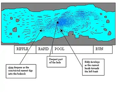 First we begin with a River that is spreading out onto a shallow section, called a flat. Past floods has created a bed of sand and the rivers spreads widely over the sandy bottom. At some point, the gradient (the fall of the river valley over distance), forces the water to cut into that downstream section of the sand bed. As sand is washed away the river flows through the gravel forming a riffle. The downward motion of the river gives the river greater eroding power and downstream of this current is bent into a focused powerful flow against a group of large boulders, forming a rapid. The river now flows hard into the left bank creating a hole of maximal depth called a pool. Having eroded the left bank, the water has lost much of its energy and will deposit some of the eroded material in a long tail of light current. This is sometimes called a run. Often this progression will repeat itself with the tail of run, spreading out into a shallow flat.
