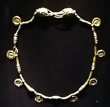 The top necklace on the right is from between the 1st century B.C.E. to the 1st century C.E. It is made of carnelian and gold. The carnelian