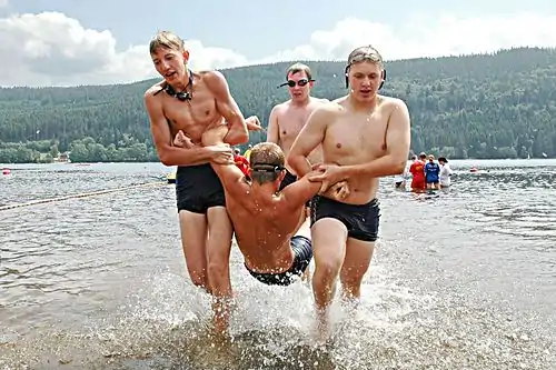 - (5b) Demonstrate your ability to pass the BSA beginner test: Jump feet-first into water over your head in depth, level off and swim 25 feet on the surface, stop, turn sharply, resume swimming, then return to your starting place.