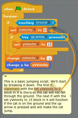Text of the comment block (if you can't read it): This is a basic jumping script. We'll start by breaking it down. The first if statement with the set yVelocity to 0 block in it is there so the cat will not fall through the ground. The next if with the set yVelocity to 15 block in it will function if the cat is on the ground and the up arrow is pressed and will make the cat jump. Out of that set of ifs the change y by yVelocity will make him fall or rise depending on the velocity variable. And the change yVelocity by -1 is gravity.