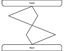 The ability to quickly find the shortest path to ephemeral food sources is a key survival factor for ants. When placed in an environment where the nest and a food source are connected by two paths of different length ants become increasingly biased towards the shorter path. In the beginning ants choose randomly between the two available paths, but ants that chose the shorter one are able to make the trip several times, thus leaving more chemoattractants on their path. The higher pheromone concentration will induce more ants to select the short path, thereby reinforcing the bias with every journey. This shows that a complex navigation problem can be solved by the colony-scale behavior emerging in a system with a single, positively valenced pheromone. [2]