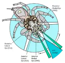 The pairs of eyes are called anterior median eyes (AME), anterior lateral eyes (ALE), posterior median eyes (PME), and posterior lateral eyes (PLE). The large principal eyes facing forward are the anterior median eyes, which provide the highest spatial resolution to a spider, at the cost of a very narrow field of view. The smaller forward-facing eyes are the anterior lateral eyes with a moderate field of view and medium spatial resolution. The two posterior eye pairs are rather peripheral, secondary eyes with wide field of view. They are extremely sensitive and suitable for low-light conditions. Spiders use their secondary eyes for sensing motion, while their principal eyes allow shape and object recognition. In contrast to insect vision, a visually-based spider´s brain is almost completely devoted to vision, as it receives only the optic nerves and consists of only the optic ganglia and some association centers. The brain is apparently able to recognize object motion, but even more to also classify the counterpart into a potential mate, rival or prey by seeing legs (lines) at a particular angle to the body. Such stimulus will result in a spider displaying either courtship or threatening signs respectively.