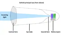 When a light beam enters the principal eye it firstly passes a large corneal lens. This lens features a long focal length enabling it to magnify even distant objects. The combined field of view of the two principal eyes´ corneal lenses would cover about 90° in front of the salticid spider, however a retina with the desired acuity would be too large to fit inside a spider´s eye. The surprising solution is a small, elongated retina, which lies behind a long, narrow tube and a second lens (a concave pit) at its end. Such combination of a corneal lens (with a long focal length) and a long eye tube (magnifying the image from the corneal lens) resembles a telephoto system, making the pair of principal eyes similar to a pair of binoculars.