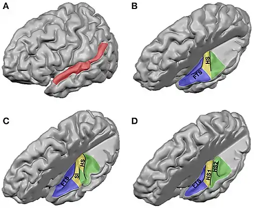 Putative 'pitch regions' in human supratemporal plane. (A) Lateral view of the left hemisphere, with STG indicated in red. (B–D) Top view of left supratemporal plane, after removal of a large part of the parietal cortex. PP, HG, and PT are indicated in blue, yellow, and green, respectively. Major sulci are outlined in black (FTS, first transverse sulcus; SI, sulcus intermediate; HS, Heschl's sulcus; HS1, first Heschl's sulcus; HS2, second Heschl's sulcus). Panels include hemispheres with one HG, an incomplete separation of HG, and two HG in (B–D), respectively.