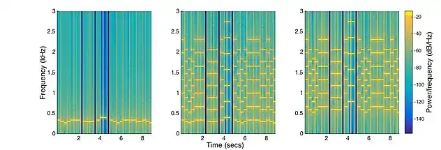 Pitch of the missing fundamental. Audio spectrographs for the melody of 'Mary had a little lamb'. (Left) Melody played with pure tones (fundamental), (middle) melody played with fundamental and first six harmonic overtones, (right) melody played with only harmonic overtones, with the spectral energy at the fundamental frequency removed. As demonstrated in the corresponding audio clips to the left, these three melodies differ in timbre, but pitch is unchanged, despite the missing fundamental and pure tone melodies having no spectral components in common.