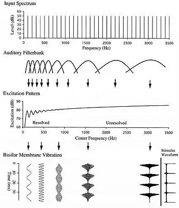 Resolved and unresolved harmonics. A schematic spectrum, excitation pattern, and simulated basilar membrane (BM) vibration for a complex tone with an F0 of 100 Hz and equal-amplitude harmonics. As can be seen in the excitation pattern and BM vibrations, higher order harmonics are 'unresolved' - that is, there is no effective separation of individual harmonics. (Description adapted from original author. Available at: http://www.europeanmedical.info/auditory-nerves/resolved-and-unresolved-harmonics-341-defining-resolvability.html)