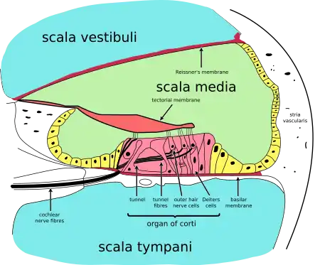 The inner ear consists of the cochlea and several non-auditory structures. The cochlea is a snail-shaped part of the inner ear. It has three fluid-filled sections: scala tympani (lower gallery), scala media (middle gallery, cochlear duct) and scala vestibuli (upper gallery). The cochlea supports a fluid wave driven by pressure across the basilar membrane separating two of the sections (scala tympani and scala media). The basilar membrane is about 3 cm long and between 0.5 to 0.04 mm wide. Reissner’s membrane (vestibular membrane) separates scala media and scala vestibuli.