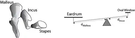The malleus articulates with the tympanic membrane via the manubrium, whereas the stapes articulates with the oval window via its footplate. Higher pressure is necessary because the inner ear beyond the oval window contains liquid rather than air. The sound is not amplified uniformly across the ossicular chain. The stapedius reflex of the middle ear muscles helps protect the inner ear from damage.