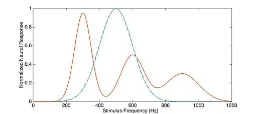 Schematic illustration of multi-peaked neurons. Blue dotted line shows a classical tuning curve for a 'single-peaked' frequency selective neuron with a best frequency (BF) at around 500Hz, as illustrated by the maximal response of this neuron to frequencies around this BF. The red solid line shows a schematic response of a multi-peaked neuron identified by Kadia and Wang (2003). In addition to a BF at 300Hz, this neuron is also excited by tones at 600Hz and 900Hz - i.e., frequencies in harmonic relation to the principal BF. Although not illustrated here, responses of such neurons to harmonic complexes (in this case, consisting of 300, 600, and 900 Hz for example) often had an additive effect, eliciting responses greater than that of a pure tone at the BF (i.e., 300Hz) alone. See reference [18]