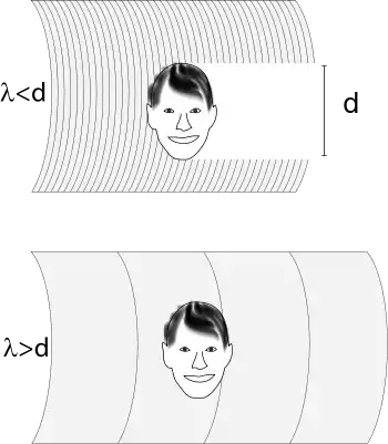Sound waves with a wavelength shorter than the head produce a sound shadow on the ear further away from the sound source. When the wavelength is shorter than the head, diffraction of the sound leads to approximately equal sound intensities on both ears.