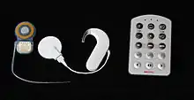 The cochlear implant (left), microphone & signal processor (middle), and the remote control accessory (right)