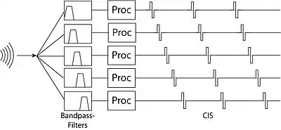 Schematic representation of Continuous Interleaved Sampling (CIS). The processing ("Proc") comprises the envelope detection, amplitude compression, digitization, and pulse modulation.