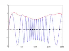 Graph showing how envelope (in red) and phase (black dots, for zero crossings) of a signal can be simply derived with the Hilbert Transform.