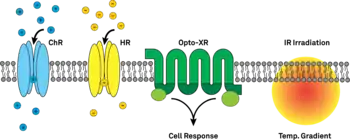 For optical control of cell pathways the Opto-XR proteins were developed,[13] where the X stands for the targeted signalling pathway. Opto-XRs consist of an animal-rhodopsin (bovine, rat etc.), with its intracellular domains exchanged for signalling sequences of the cell.[14] This allows optic regulation of the cells signalling pathway. The signaling sequences can either be activated or deactivated by conformational changes induced by light falling on the rhodopsin. This allows for specific activation of certain receptor pathways like serotonin or adrenergic signalling.[13][15]