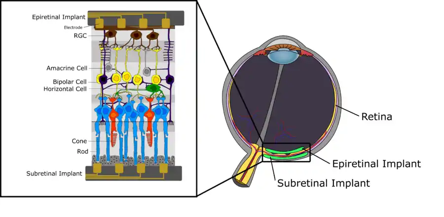 As mentioned previously in this wiki, the retina is a light-sensitive tissue located in the back of the eye consisting of different layers which contain a variety of cell types. The retina is primarily involved in neural visual processing with signals originating at photoreceptors and travelling to the brain by the axons of the ganglion cells. When this stratified tissue degenerates, permanent vision loss can occur [1]. This is often caused by retinal degenerative diseases such as age-related macular degeneration (AMD) and retinitis pigmentosa (RP), which are the two most prevalent conditions that progressively lead to permanent visual impairments and loss. Currently, there are no cures for these two retinal diseases and with modern therapies only having the capacity to slow down disease progression, strategies are needed to restore patients’ vision. One of the tools currently being investigated is retinal prosthesis technology that stimulates viable retina tissue to reinstate vision, which will be described in a later section[2].
