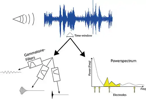 These generally involve applying a non-linear gain on the sound (as an input audio signal with a ~30dB dynamic range must be compressed into an electrical signal with just a ~5dB dynamic range), and passing it through parallel filter banks. The first waveform strategy to be tried was Compressed Analog approach. In this system, the raw audio is initially filtered with a gain-controlled amplifier (the gain-control reduces the dynamic range of the signal). The signal is then passed through parallel band-pass filters, and the output of these filters goes on to stimulate electrodes at their appropriate locations.