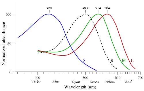 - 3. L-cones absorb yellow to red light. The maximum absorption wavelength is 565nm