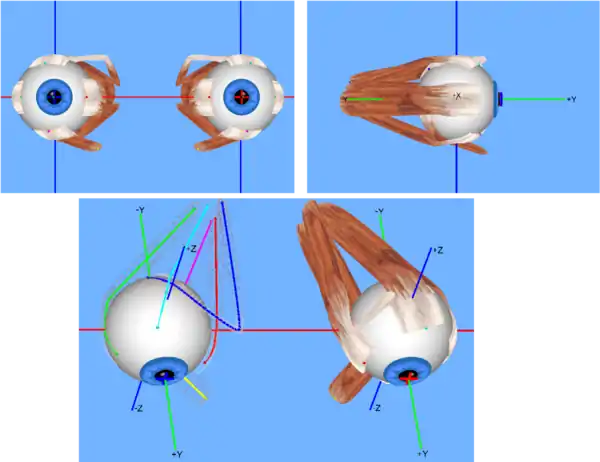 As you can see, the extra-ocular muscles (2,3,4,5,6,8) are attached to the sclera of the eyeball and originate in the annulus of Zinn, a fibrous tendon surrounding the optic nerve. A pulley system is created with the trochlea acting as a pulley and the superior oblique muscle as the rope, this is required to redirect the muscle force in the correct way. The remaining extra-ocular muscles have a direct path to the eye and therefore do not form these pulley systems. Using these extra-ocular muscles, the eye can rotate up, down, left, right and alternative movements are possible as a combination of these.