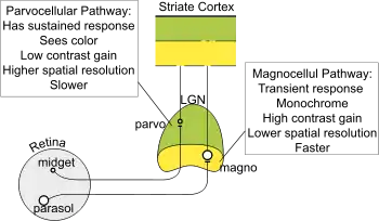 - ↑ Livingstone, Margaret S and Hubel, David H (1987). "Psychophysical evidence for separate channels for the perception of form, color, movement, and depth". The Journal of Neuroscience 7 (11): 3416-3468.